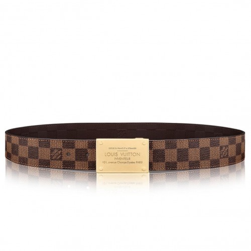 A revamped version of our iconic LV Inventeur buckle, featuring a more modern look with its smaller rivets, new font and brushed metallic finishing. All versions are fully reversible, with Damier Ebene canvas on one side and leather on the other.