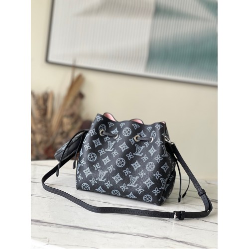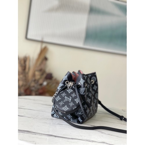 Louis Vuitton unveils the Bella bucket bag in Mahina calf leather with a perforated Monogram pattern..