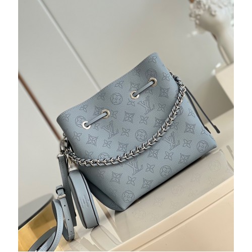 Louis Vuitton unveils the Bella bucket bag in Mahina calf leather with a perforated Monogram pattern..