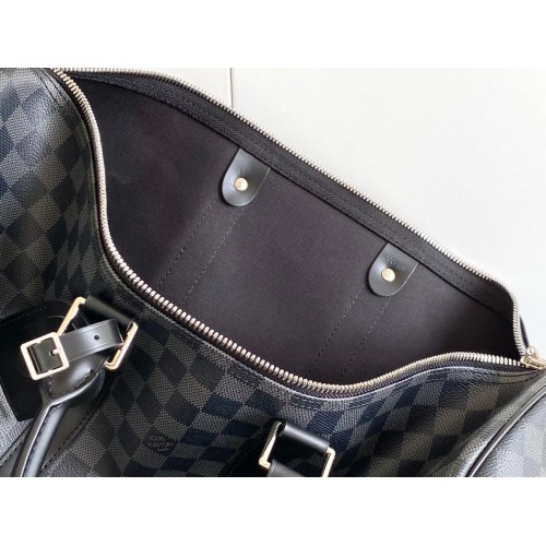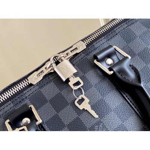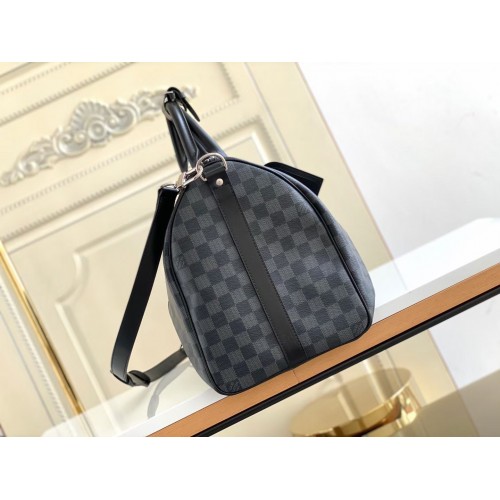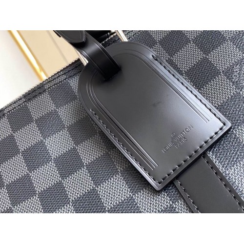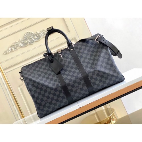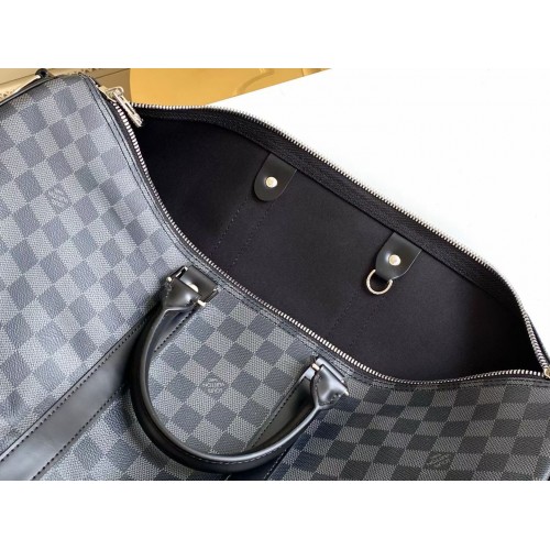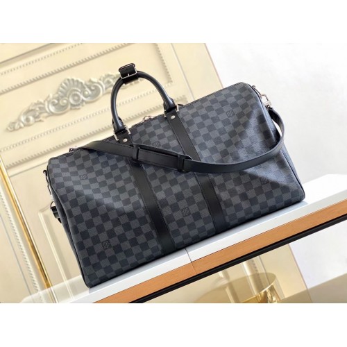The Keepall 50B takes on an original Louis Vuitton signature look with Damier Graphite 3D canvas in ..