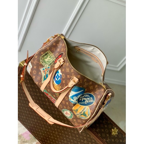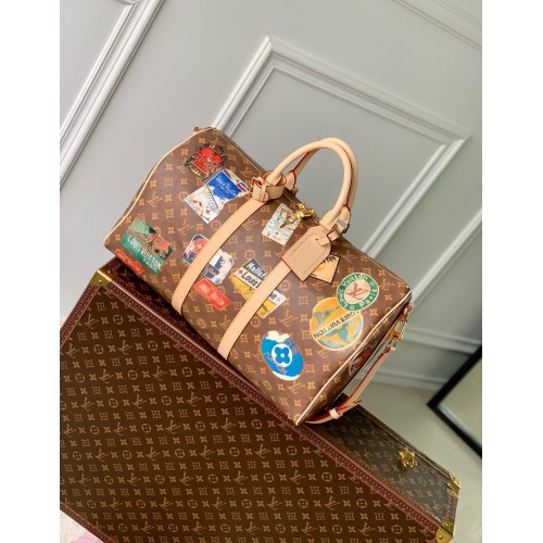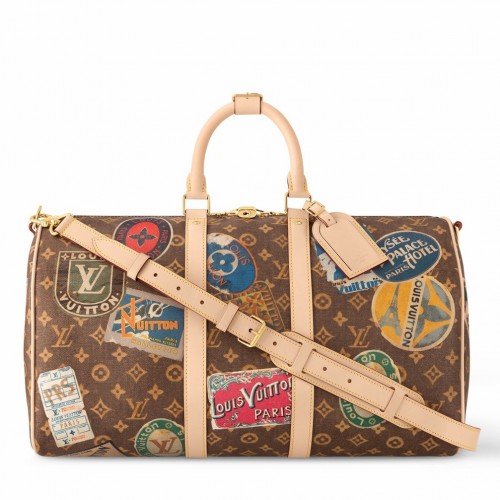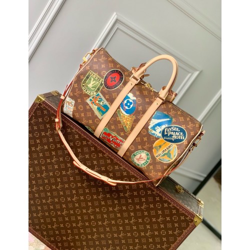 Made from Monogram canvas, the Keepall Bandoulière 45 is adorned with Louis Vuitton travel stickers, giving the bag a glamorous tried-and-true feel, perfect for any traveler. The natural cowhide leather trim adds yet another vintage detail. This cabin-size bag can be carried by its two top handles, or with its removable and adjustable shoulder strap.