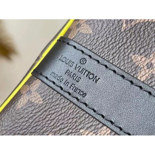 With side bands in saffron-orange leather that pop on the Monogram Macassar canvas, this Keepall Ban..