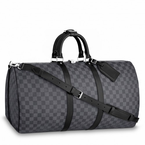 The Keepall 50B takes on an original Louis Vuitton signature look with Damier Graphite 3D canvas in ..