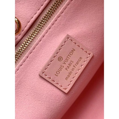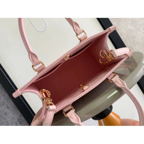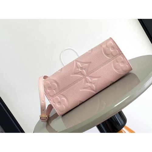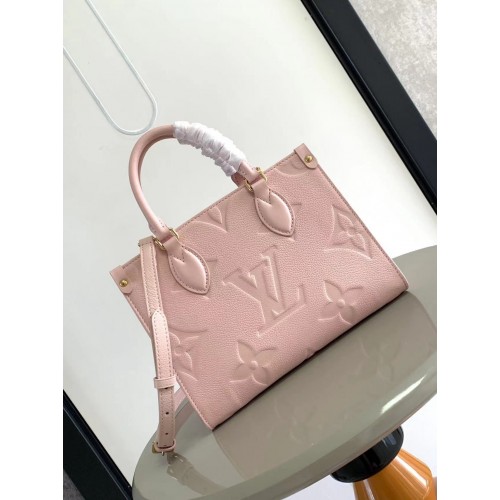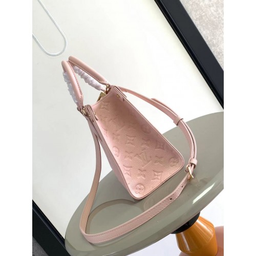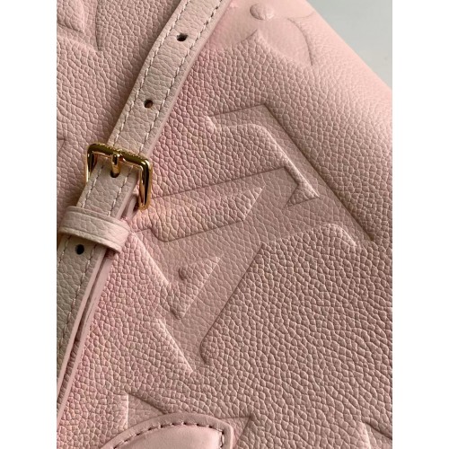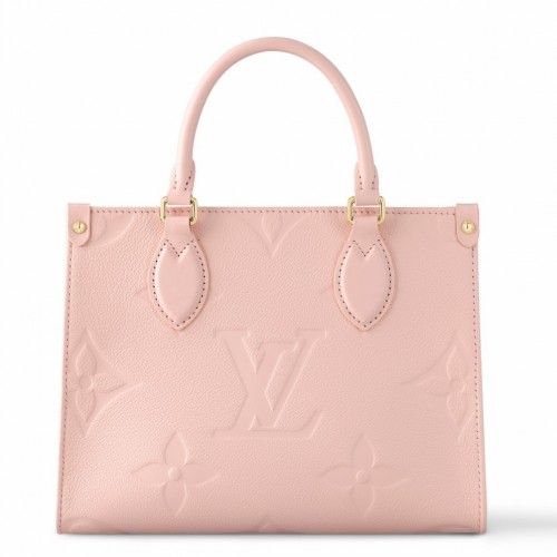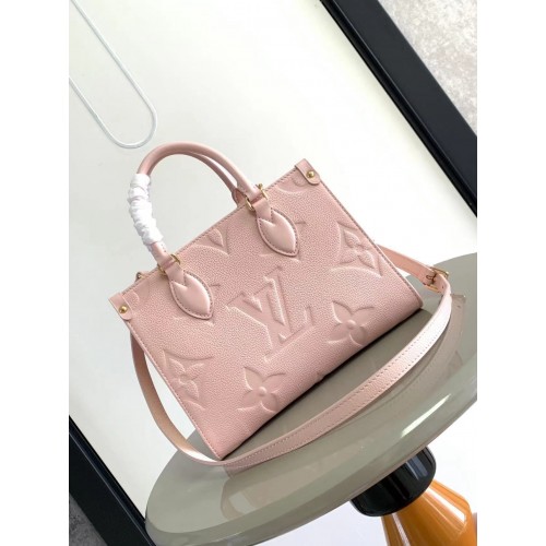 The OnTheGo PM is a tote-style handbag made from pastel-colored Monogram Empreinte leather, with its distinctive Monogram embossing. The four riveted corner-tabs evoke the House’s famed trunks. Inside, a large flat zipped pocket keeps papers and cards organized. Two rolled-leather top handles and a removable and adjustable strap enable various carry options.