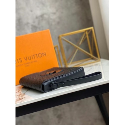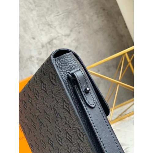 This new version of the A4 Pouch is styled in sumptuous Monogram-embossed black Taurillon leather. The front flap is secured by the exclusive S Lock, an innovative magnetic closure that updates a historic Louis Vuitton trunk clasp. Ideal for holding documents, a digital tablet and other everyday necessities, it’s easy to carry with its removable wristlet.