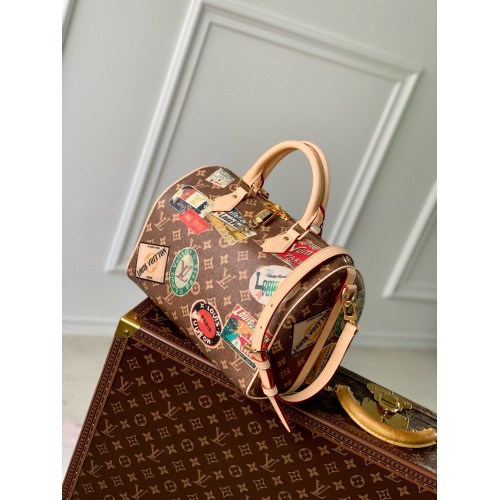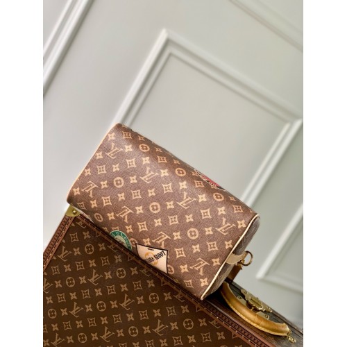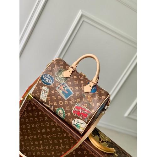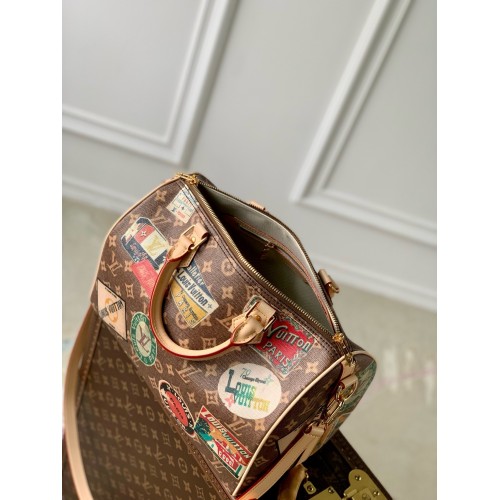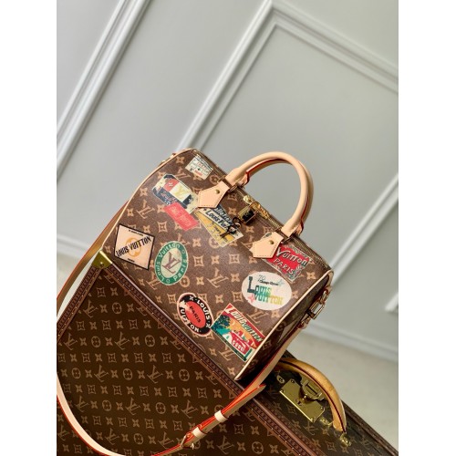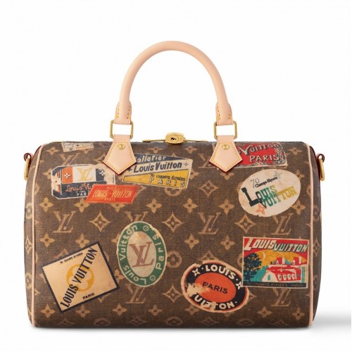 The Speedy Bandoulière 30 handbag comes in a version inpired by our archival Monogram canvas: a blend of cotton and linen with a sheer resin coating. Embellished with a patchwork of hotel labels in homage to Gaston-Louis Vuitton’s legendary collection, this timeless piece is trimmed with the Maison’s natural cowhide-leather, an elegant heritage touch.