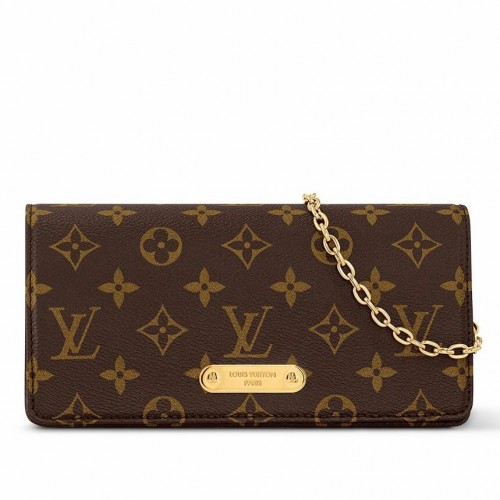 The Lily wallet on chain in Monogram canvas combines a sleek rectangular shape with a subtle retro look. Its flap features a gold-tone plate embellished with rivets and engraved with the Louis Vuitton signature. Large enough to carry essentials from day to evening, it offers different carry options thanks to its removable, adjustable chain with an LV Circle charm.