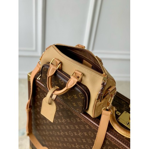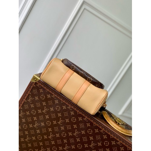 The Keepall Bandoulière 25 is made from beige grained leather with tonal suede details and hardware with an aged-gold aspect. The bag’s revamped design includes an outside zipped pocket in Monogram canvas, providing easy access to essentials. The pocket closes with a cord zip-pull. A removable and adjustable leather strap enables shoulder carry.