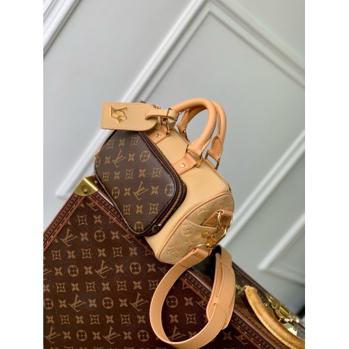 The combination of beige grained leather with embossed suede details and Monogram canvas gives the O..