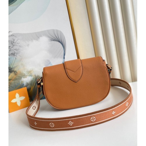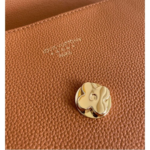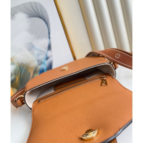 The LV Pont 9 Soft MM is a rounded handbag made from grained calfskin with smooth cowhide lining in a contrasting color and a wide two-color strap decorated with Monogram Flowers. The two sides of the strap are woven separately and then stitched together by hand. The new LV Circle signs this bag.