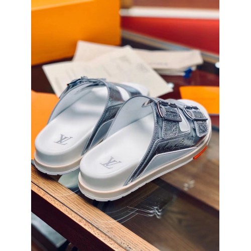 The LV Trainer mule is a lightweight, comfortable style in blue suede calf leather. Its upper strap ..