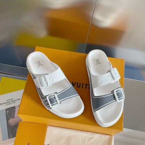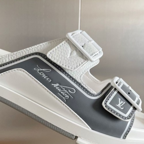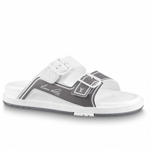 The LV Trainer mule is a relaxed style in metallic silver leather. It features two adjustable straps..
