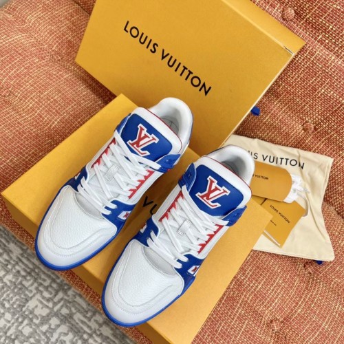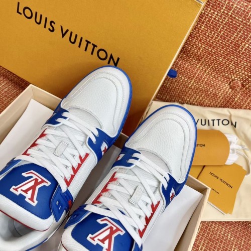 Louis Vuitton Men's LV Trainer Sneakers In White/Blue Leather