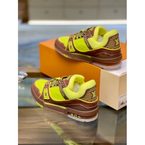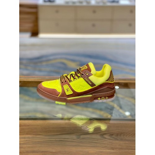 This version of the LV Trainer sneaker combines fluorescent, Monogram-embossed nubuck calf leather w..