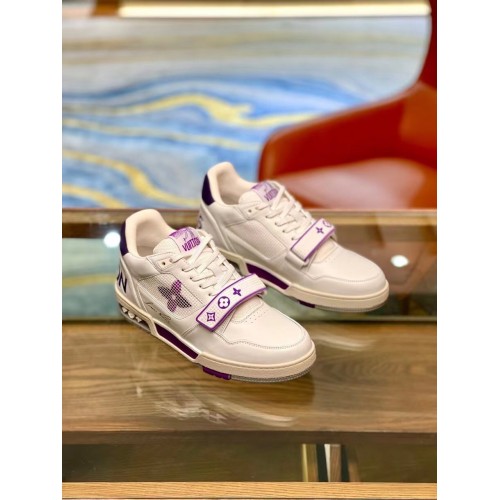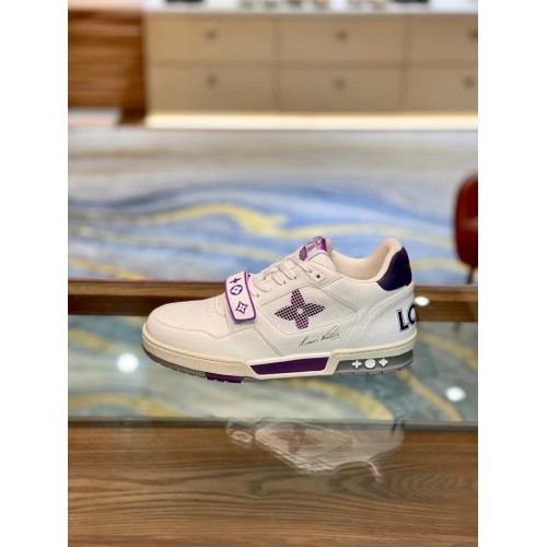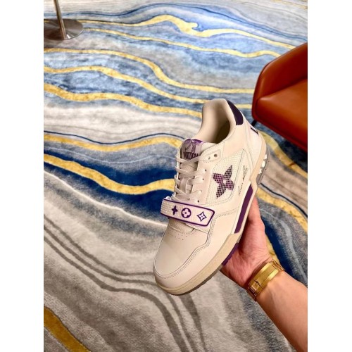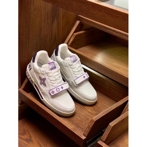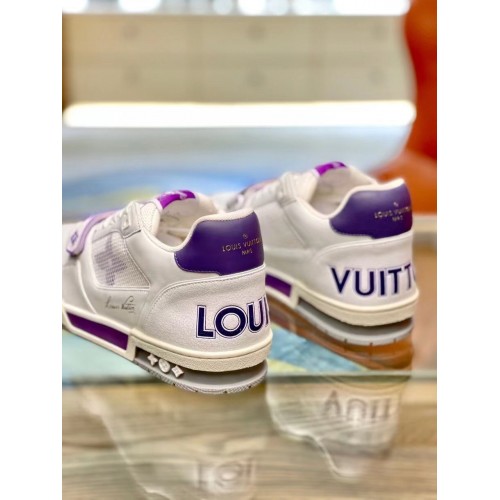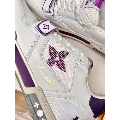 Louis Vuitton Men's LV Trainer Sneakers In White/Purple Calfskin