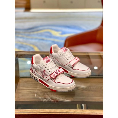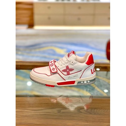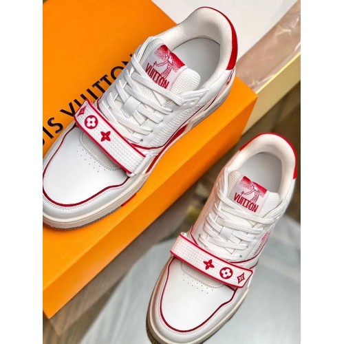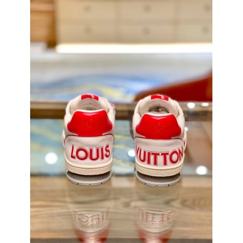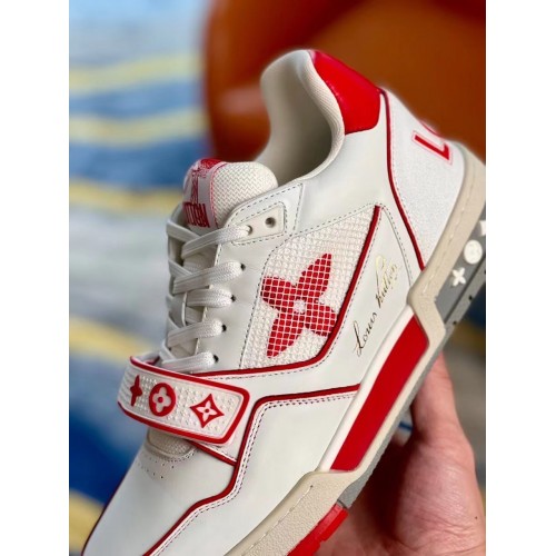 Louis Vuitton Men's White/Red LV Trainer Sneakers with #54