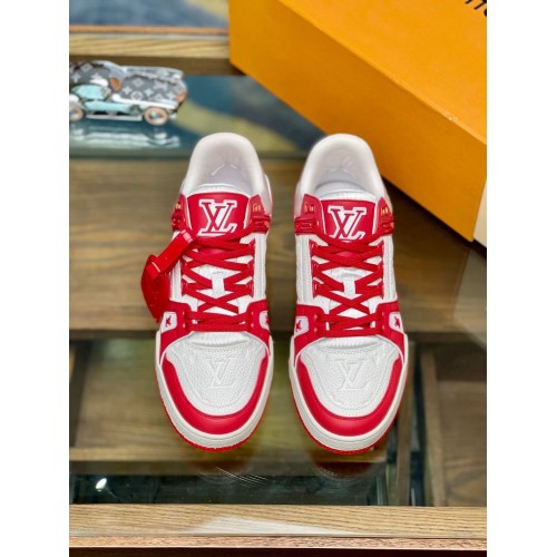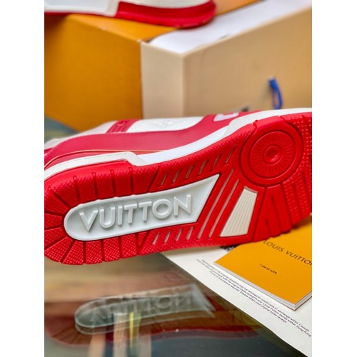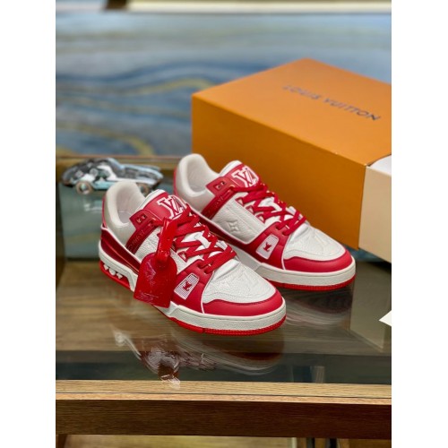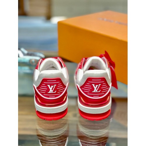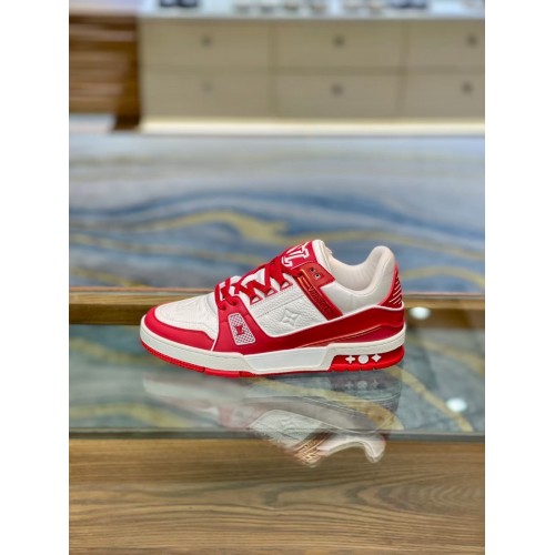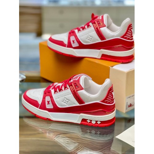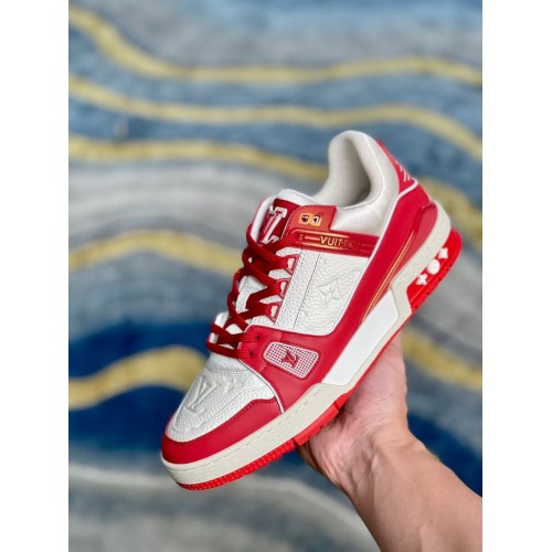 Louis Vuitton Men's LV Trainer Sneakers In White/Red Leather