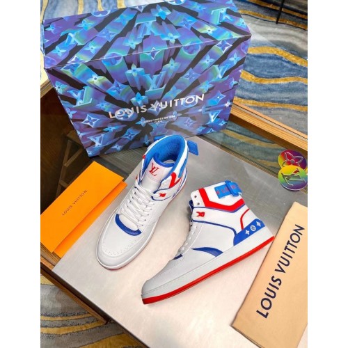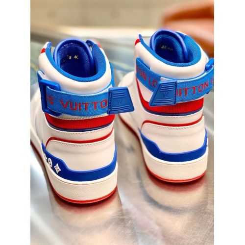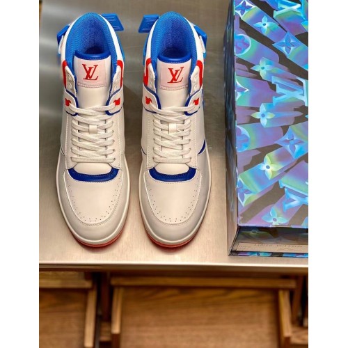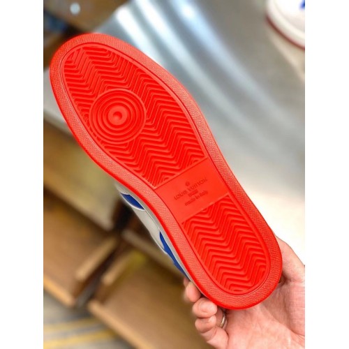 This red, white and blue version of the LV Trainer sneaker combines smooth and grained calf leather ..