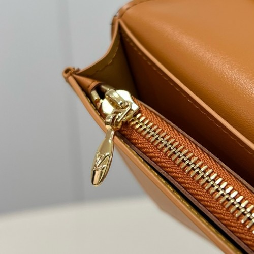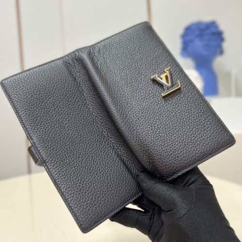 The LV Vertical wallet is an elegant design crafted from soft, grained Taurillon leather. It opens to reveal a contrasting lining, as well as eight card slots, a zipped coin pocket and a large, V-shaped slot for tickets and bills. This wallet features a distinctive sliding closure with an LV Initials accessory inspired by the iconic Capucines bag.