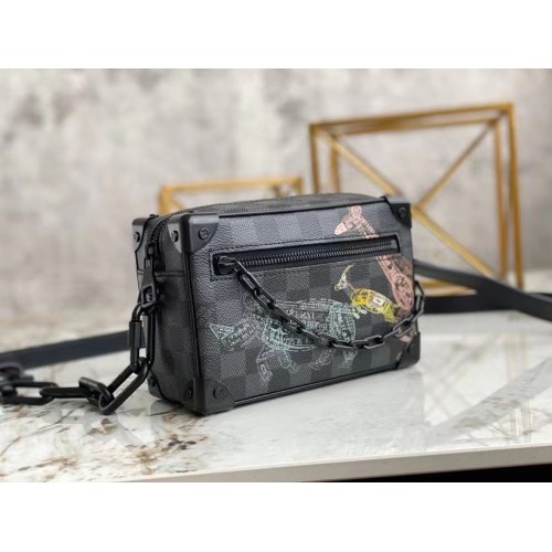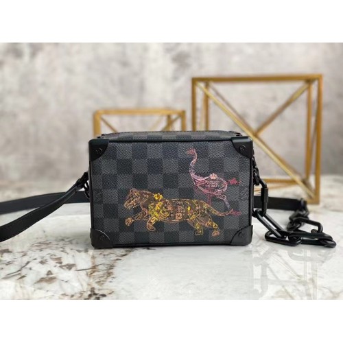 This Trio Messenger is made from Damier Graphite canvas twisted with a print of a herd of wild anima..
