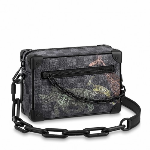 The Damier Graphite canvas of this Mini Soft Trunk is decorated with a troop of wild animals. On closer look, the illustrations reveal to be created out of multiple passport stamps. This bag’s rectangular form and reinforced corners are a nod to the House’s historic trunks. The chunky chain enables shoulder wear.