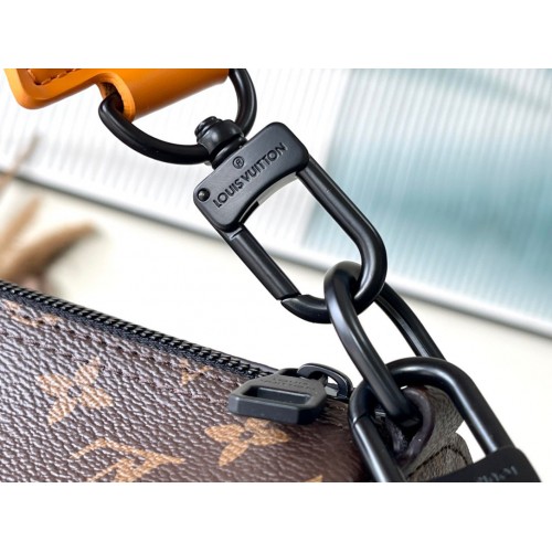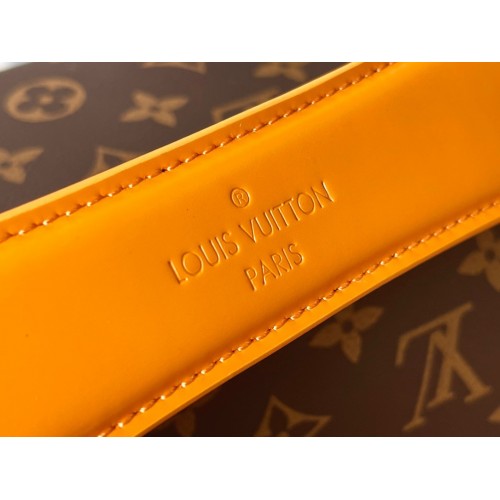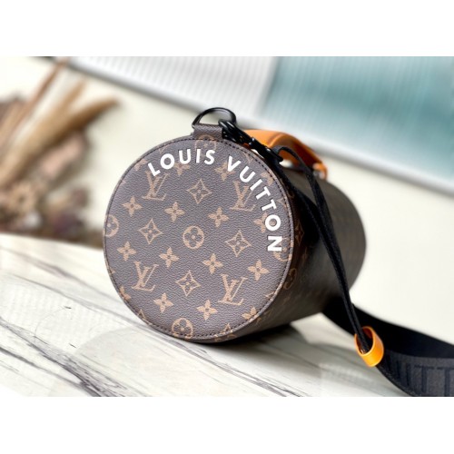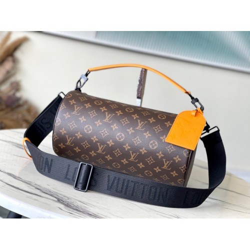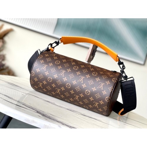 With its supple curves and cylindrical shape, the Soft Polochon bag in Monogram Macassar canvas with accents of saffron-color leather is a modern option for carrying daily necessities. This body-friendly bag features a unique removable leather handle and a removable, and adjustable, textile strap for multiple carry options.