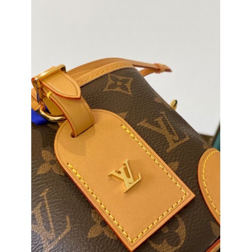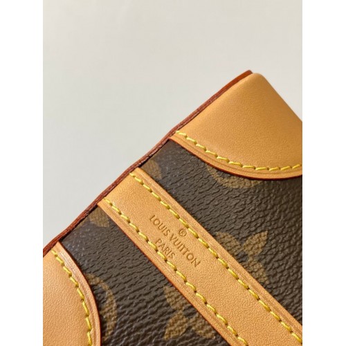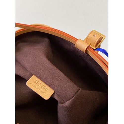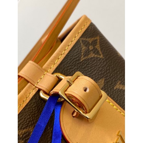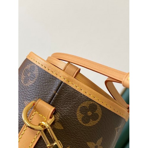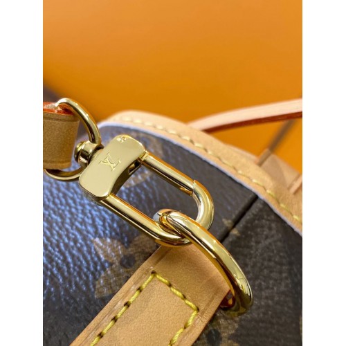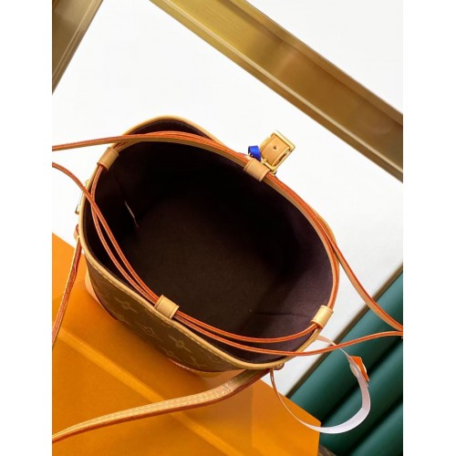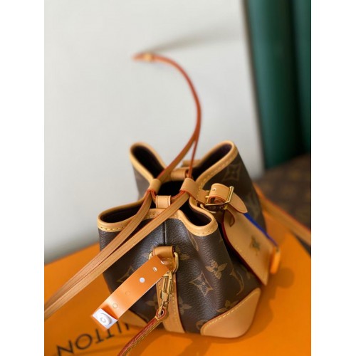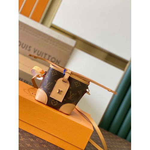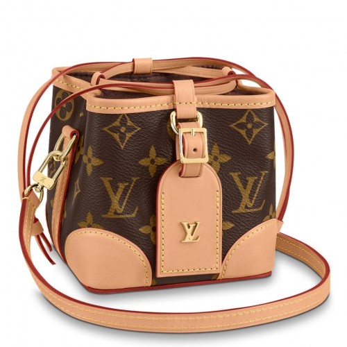 A miniature interpretation of the iconic Noé bag, the Noé purse appeared on the runway at Louis Vuitton's Fall-Winter 2020 fashion show. This version is crafted from Monogram canvas with natural leather details, including a luggage tag and a removable strap.