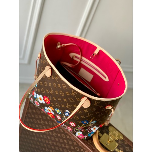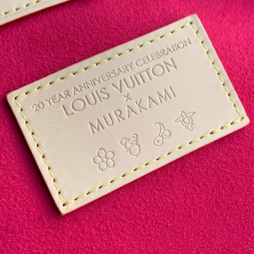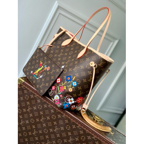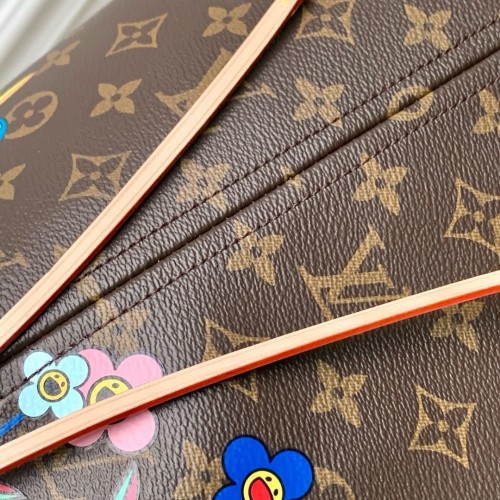 This timeless Neverfull MM handbag combines two iconic signatures as part of the celebratory re-edition of the Louis Vuitton x Murakami collection. The spacious Monogram canvas body is playfully overlaid with Monogram Flowers that have been reworked in Takashi Murakami’s renowned superflat aesthetic. Natural cowhide leather highlights the top, the handles and the side ties, while the inside is lined with colorful striped fabric. Complete with a zipped interior pocket and a removable pouch.