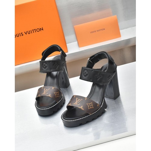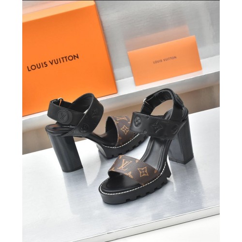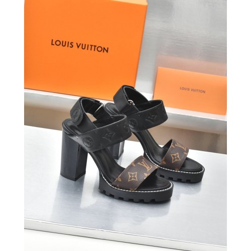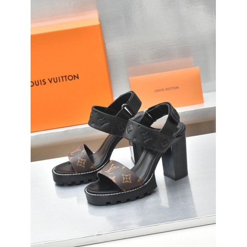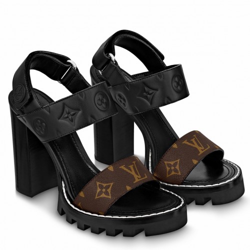 The Star Trail sandal combines straps in Monogram canvas and Monogram-embossed calf leather for a refined signature look. This model is notable for its high heel and treaded rubber outsole, creating the bold silhouette which is a key feature of the Star Trail line. The back strap is adjusted with velcro for a practical, sporty touch.