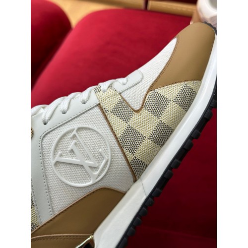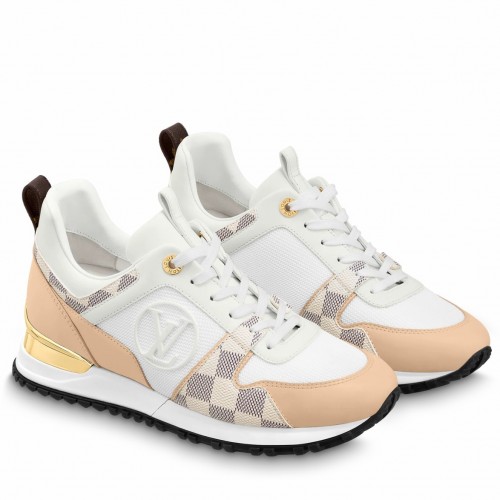 This summery version of the Run Away sneaker combines technical mesh with Louis Vuitton's emblematic natural calf leather and Damier Azur canvas. This model is instantly recognizable for its stabilizer in gold-tone metal, which is engraved with the LV Circle signature. The distinctive wedge-shaped outsole, inspired by running shoes, discreetly adds extra height.