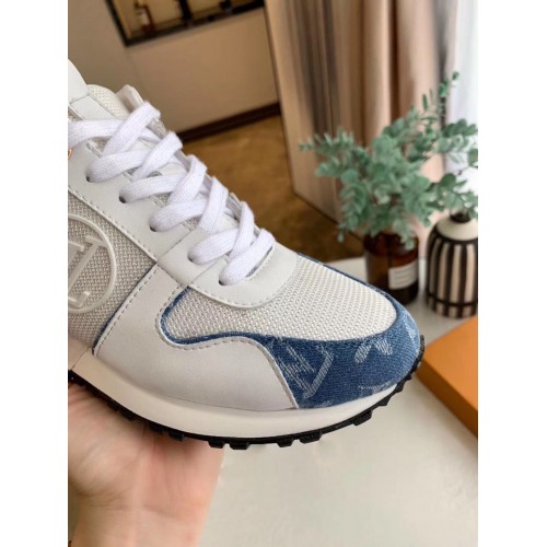 Reinterpreting a classic running shoe, the Run Away sneaker is one of the icons of the Louis Vuitton shoe collection. This version contrasts blue Monogram denim with white calf leather for a fresh, summery feel. It is signed with the LV Circle logo on the side, while the wedge-shaped outsole adds extra height.