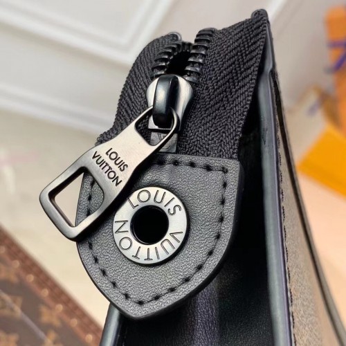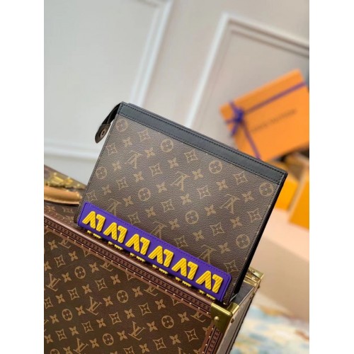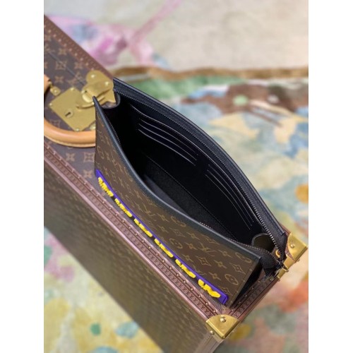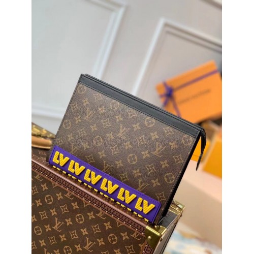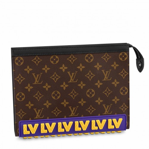 For fall 2021, the LV Rubber look gives the Pochette Voyage an upbeat, sophisticated signature touch. The House’s initials appear across the bottom of the pouch on a colorful 3D latex appliqué. Great for storing small travel essentials, this is an easy-to-carry accessory that slips neatly into a larger bag or suitcase.