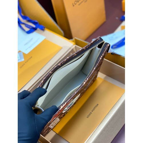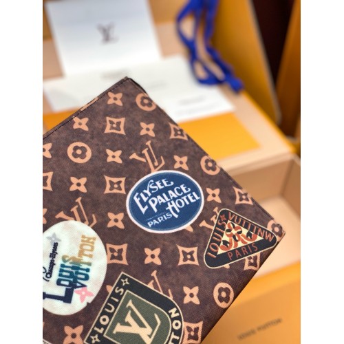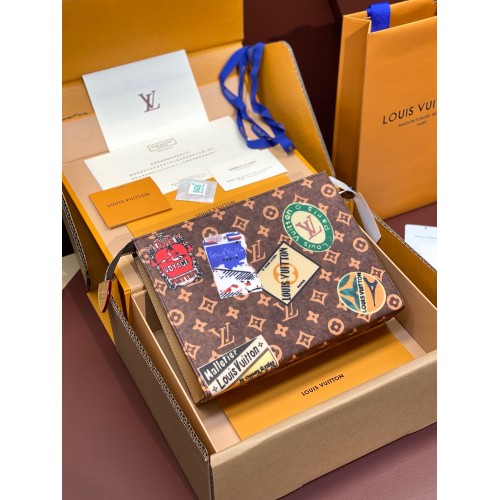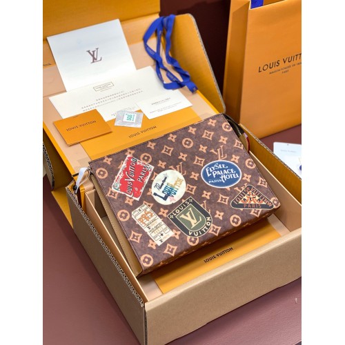 The Toilet Pouch is made from Monogram canvas, decorated with glamourous vintage Louis Vuitton travel stickers. The functional pouch suddenly has the potential to become a fascinating clutch. Its interior design includes two patch pockets for papers or other essentials, making it a stylish way to carry smaller personal belongings.