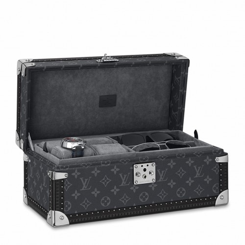 This elegant watch case in masculine Eclipse Monogram canvas has a removable microfiber cushion and ..