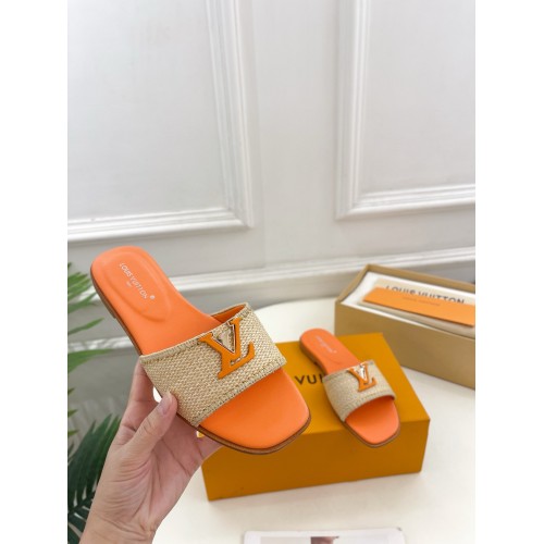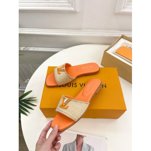 The LV Capri flat mule is a relaxed yet refined style with a wide front strap in raffia with artisan..