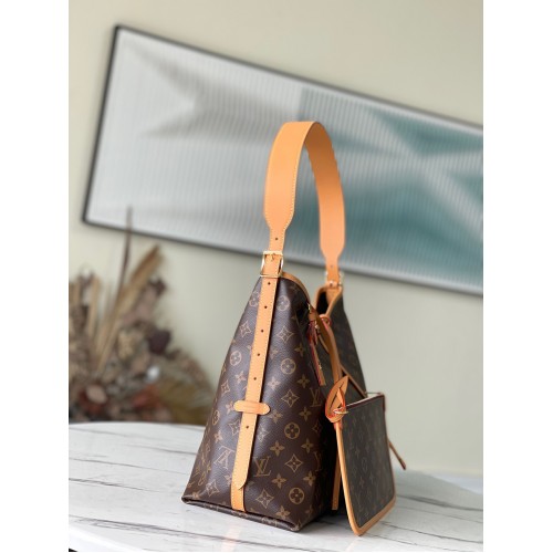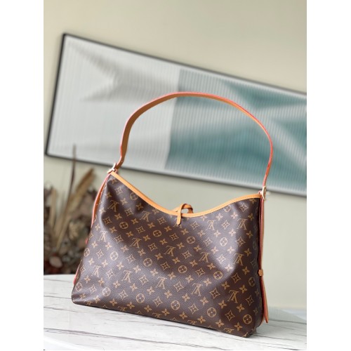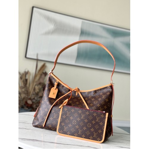Louis Vuitton launches the CarryAll MM handbag in Monogram canvas with natural leather trim. Its contemporary, body-friendly design and roomy interior make this a fantastic everyday bag. Inside zipped pockets and a removable zipped pouch deliver even more functionality. A gold-color buckle allows the handle to be shortened or lengthened.