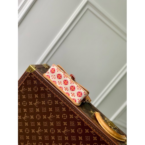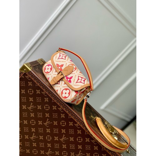 This edition of the Nano Diane bag belongs to the LV By the Pool summer collection. It comes in coated canvas printed with a colorful Monogram Tiles motif which evokes the Mediterranean. Leather trim complements this miniature version of the Diane bag, which is distinguished by its rounded flap and belt-style closure.