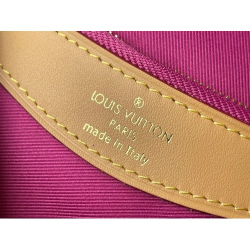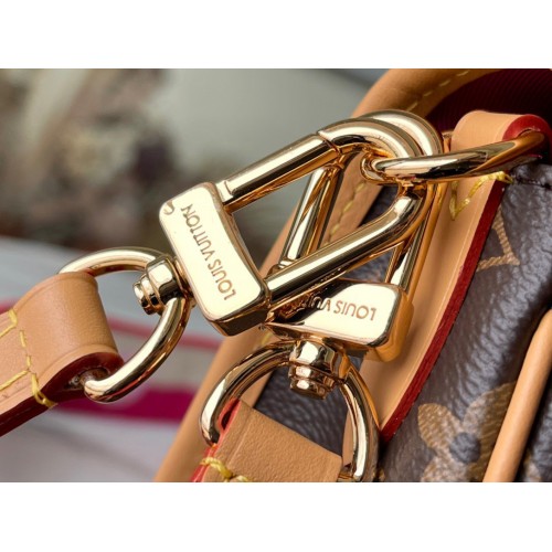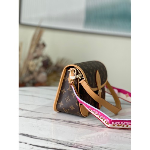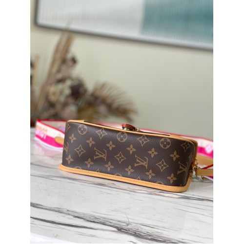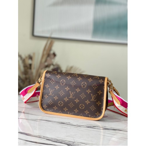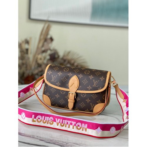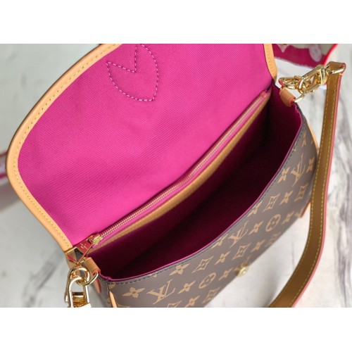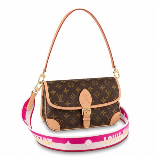 The Diane satchel in Monogram canvas revisits a classic model from the 90s, combining such vintage details as leather corners and an archival-inspired buckle with the modern functionality of smart pockets and a well-organized interior. The exclusive wide jacquard strap reverses from a bold Louis Vuitton signature to a subtle Monogram Flower motif.