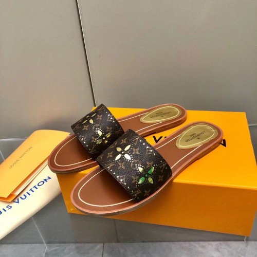 One of Louis Vuitton's emblematic styles, the Lock It flat mule is revisited in Monogram canvas. The front strap is decorated with Monogram-Flower perforations, which are lined with metallic gold leather to create a shimmering effect. Completing this refined design, the padded insert on the insole is also covered with gold leather.