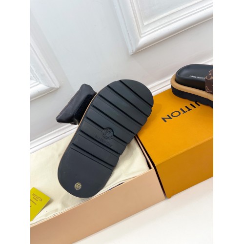 The LV Sunset flat comfort sandal is revisited in Louis Vuitton's signature Monogram canvas. Excepti..