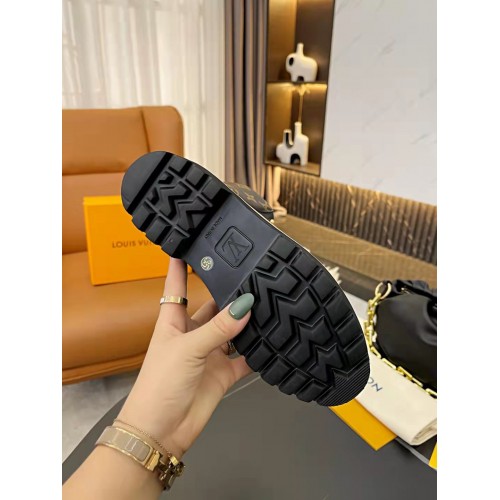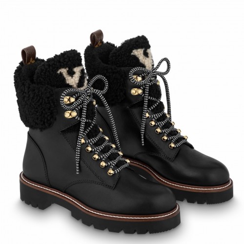 This wintry version of the Territory flat ranger combines smooth calf leather with a collar and tongue in warm, fluffy shearling. Contrasting shearling inserts form the LV Initials and a Monogram Flower. Inspired by hiking boots, this model features sporty laces, rows of gold-tone eyelets and a treaded rubber outsole.