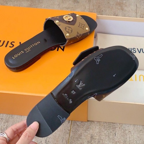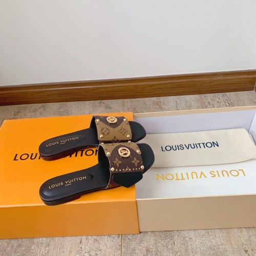 The LV Frame flat mule is a casual-chic style which pairs Monogram and Monogram Reverse canvas. It is notable for its wide front strap with a distinctive detail inspired by the closure of the Camera Box bag, which includes gold-tone studs and an LV Circle signature. This model is finished with a durable leather outsole.