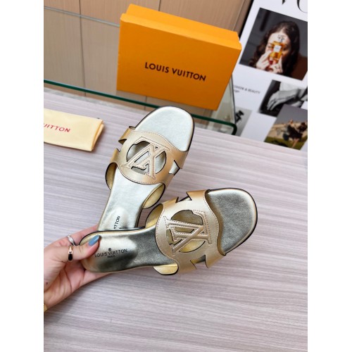 The LV Isola flat mule is crafted from metallic lambskin. This timelessly elegant style is notable f..