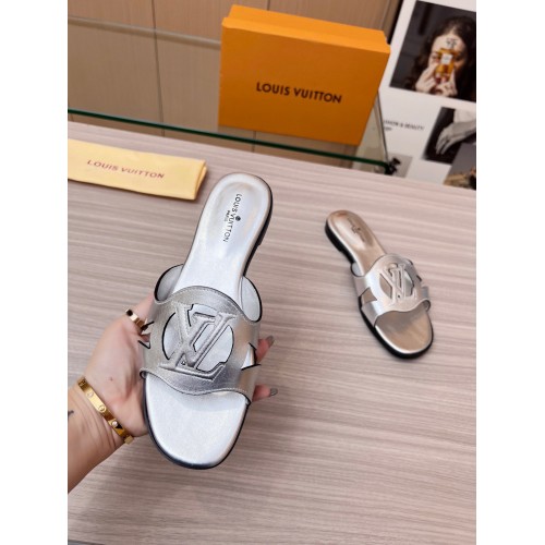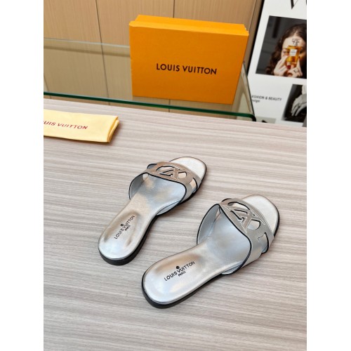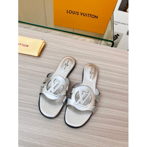 The LV Isola flat mule is crafted from metallic lambskin. This timelessly elegant style is notable f..